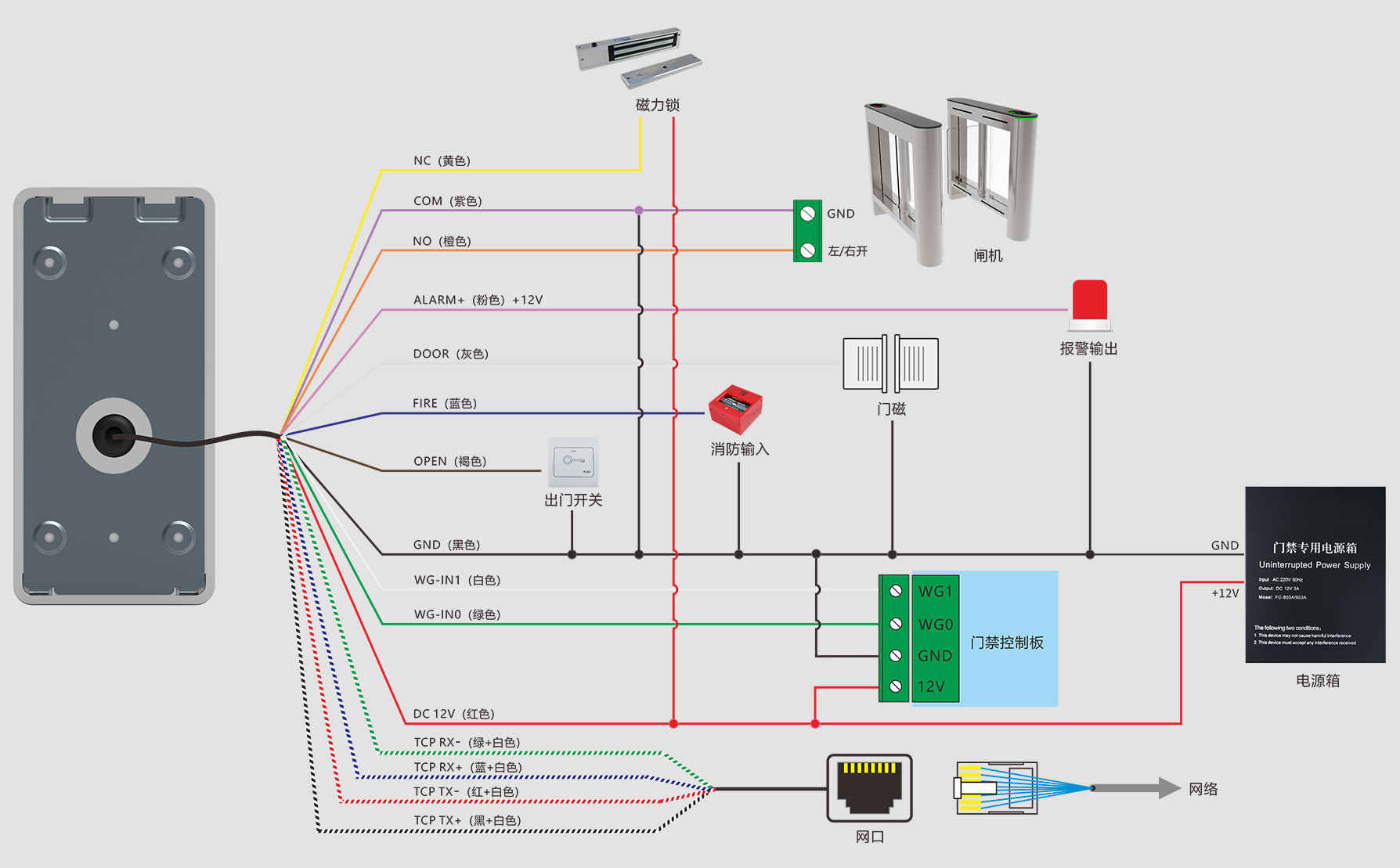 出门开关×1、门磁接口×1、报警输出×1、Wiegand输出×1、门锁控制×1