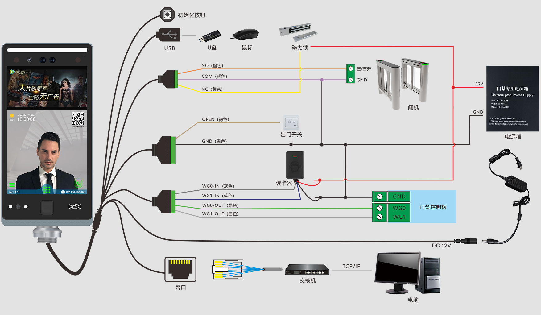 出门开关×1、门磁接口×1、消防输入×1、报警输出×1、Wiegand输出×1、Wiegand输入×1、门锁控制×1、USB×1、RS485×1