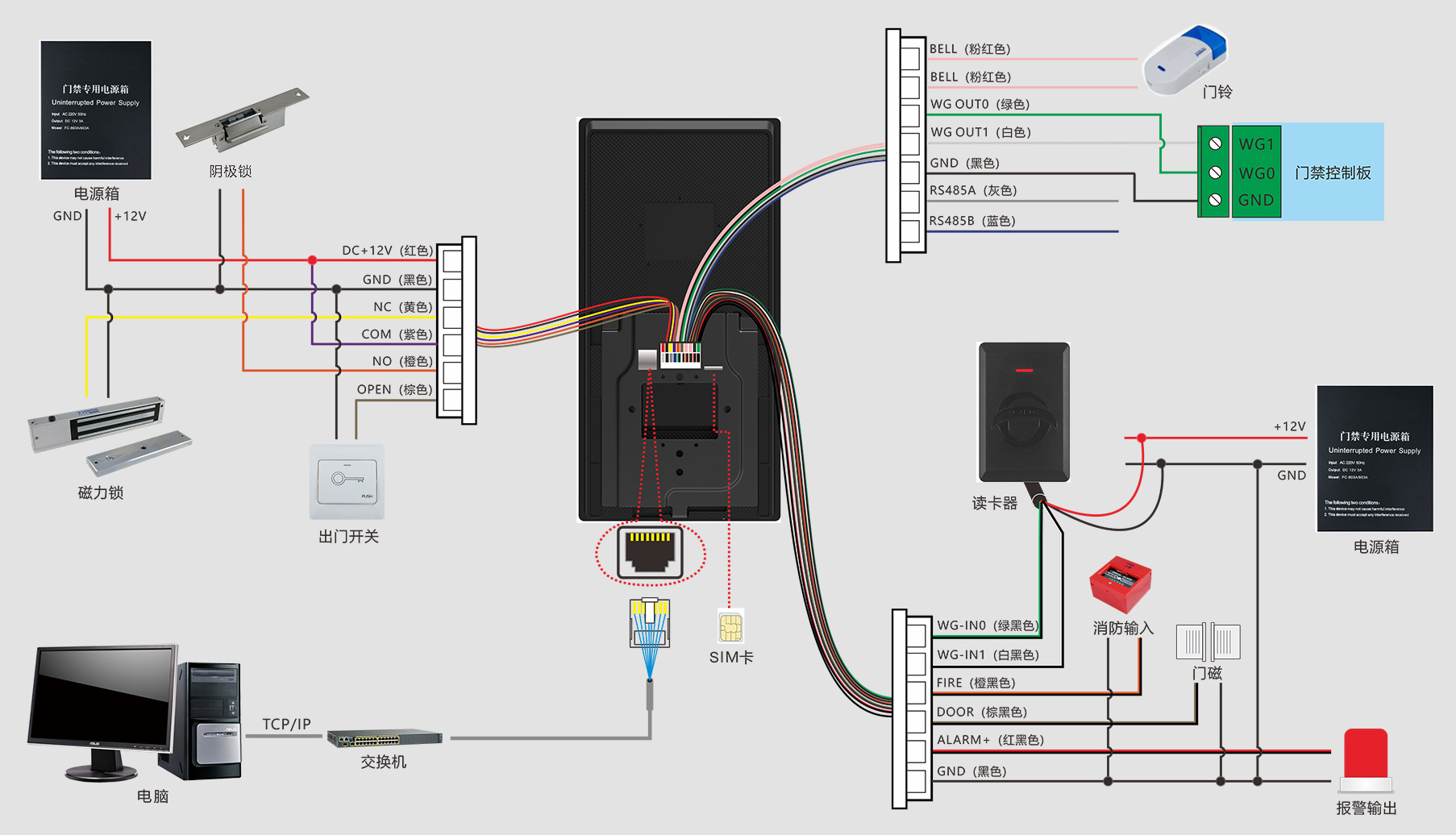 出门开关×1、门磁接口×1、消防输入×1、报警输出×1、