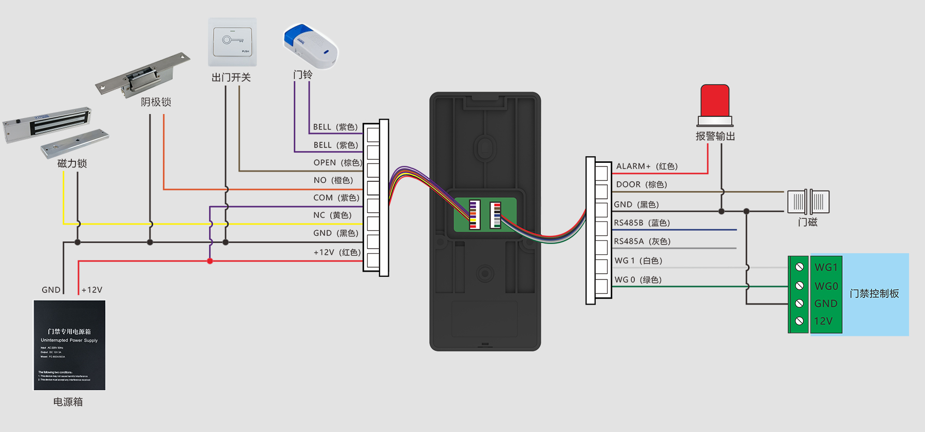 出门开关×1、门磁接口×1、报警输出×1、Wiegand输出×1、门锁控制×1