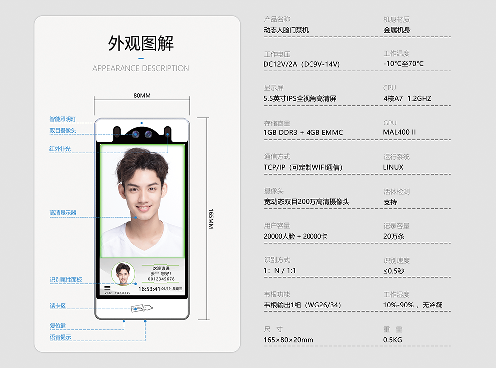 使用了FC-8100T人脸门禁机,提供一下该产品的外观尺寸与技术参数?