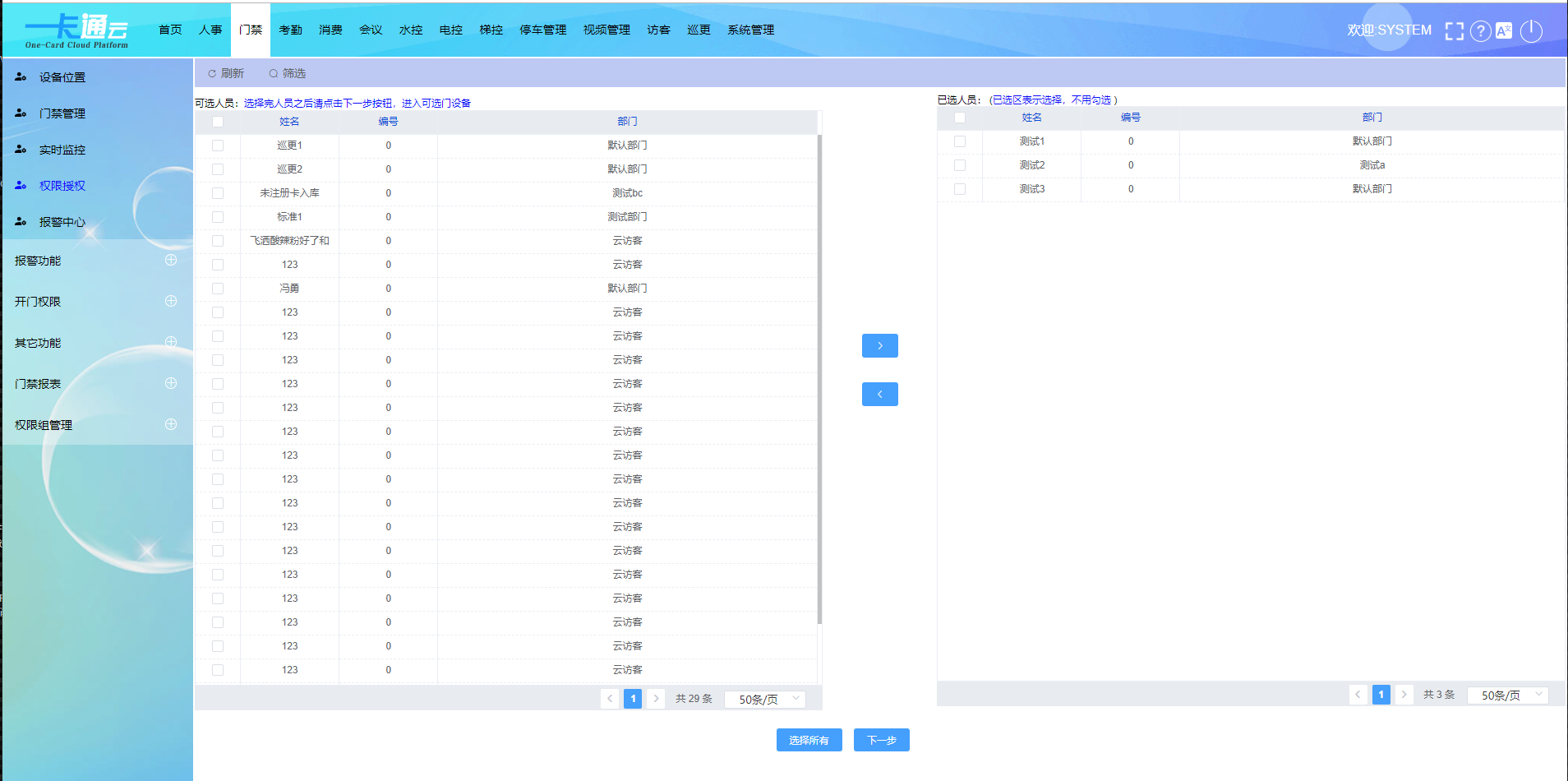 第三、在‘门禁’模块中‘权限授权’菜单,选择需要授权人脸权限的人员至右边框,点击‘下一步’
