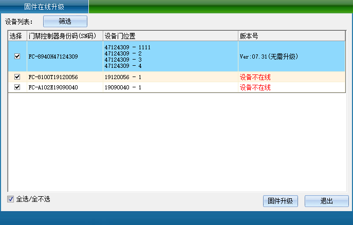 您好,欢迎使用我们的产品,谢谢您的支持。FC-8100T固件可通过软件在线升级,以下是具体操作方法:首先,请确保FCARD3500软件中已安装FC-8100T人脸机设备并且人脸机处于在线状态,然后点击软件菜单中的‘门禁信息’菜单下的‘其他功能设置’,点击最后一个子菜单‘固件在线升级’,即可选中相应设备升级固件。(附图)