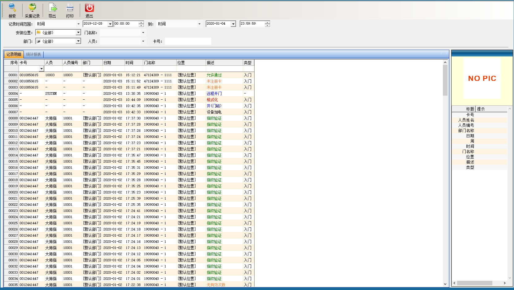 您好,欢迎使用我们的产品,谢谢您的支持。首先,请确保FCARD3500软件中已安装FC-8200T人脸机设备并且人脸机处于在线状态,然后点击软件左边常用功能栏里的‘出入记录’菜单进入,在此菜单下可实现采集记录和查看记录。点击‘采集记录’按钮,可选择相对应的门设备(人脸机、指纹机、门禁板)采集(附图)。采集完成后,点击‘搜索’按钮,即可查看所有出入记录,如果人脸机有开启验证抓拍功能(默认是开启状态),点击记录则可查看该条记录验证时实时抓拍的照片。