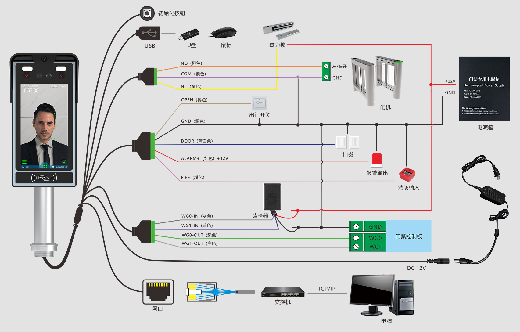 出门开关×1、门磁接口×1、消防输入×1、报警输出×1、Wiegand输出×1、Wiegand输入×1、门锁控制×1、USB×1、RS485×1