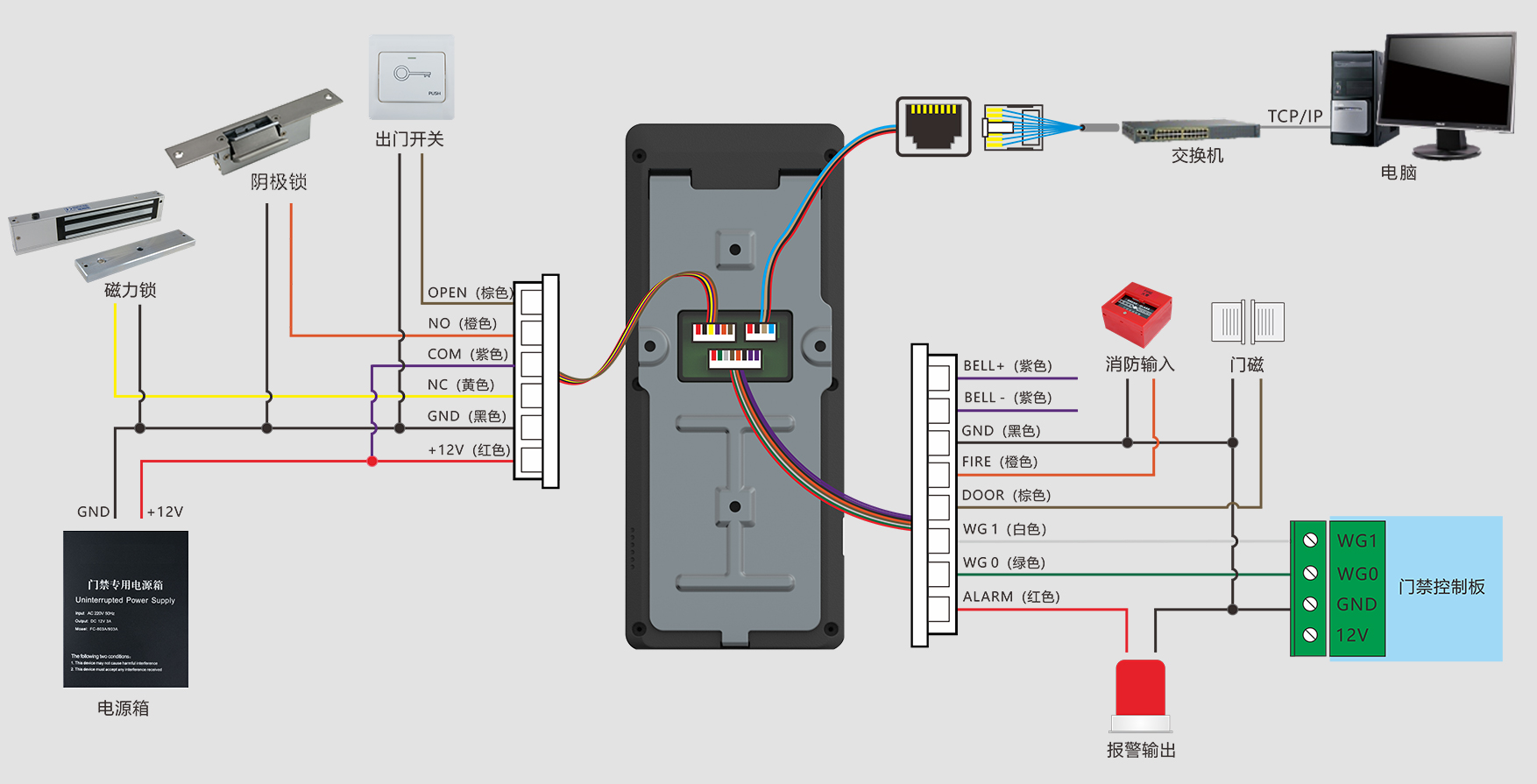 出门开关×1、门磁接口×1、报警输出×1、Wiegand输出×1、门锁控制×1