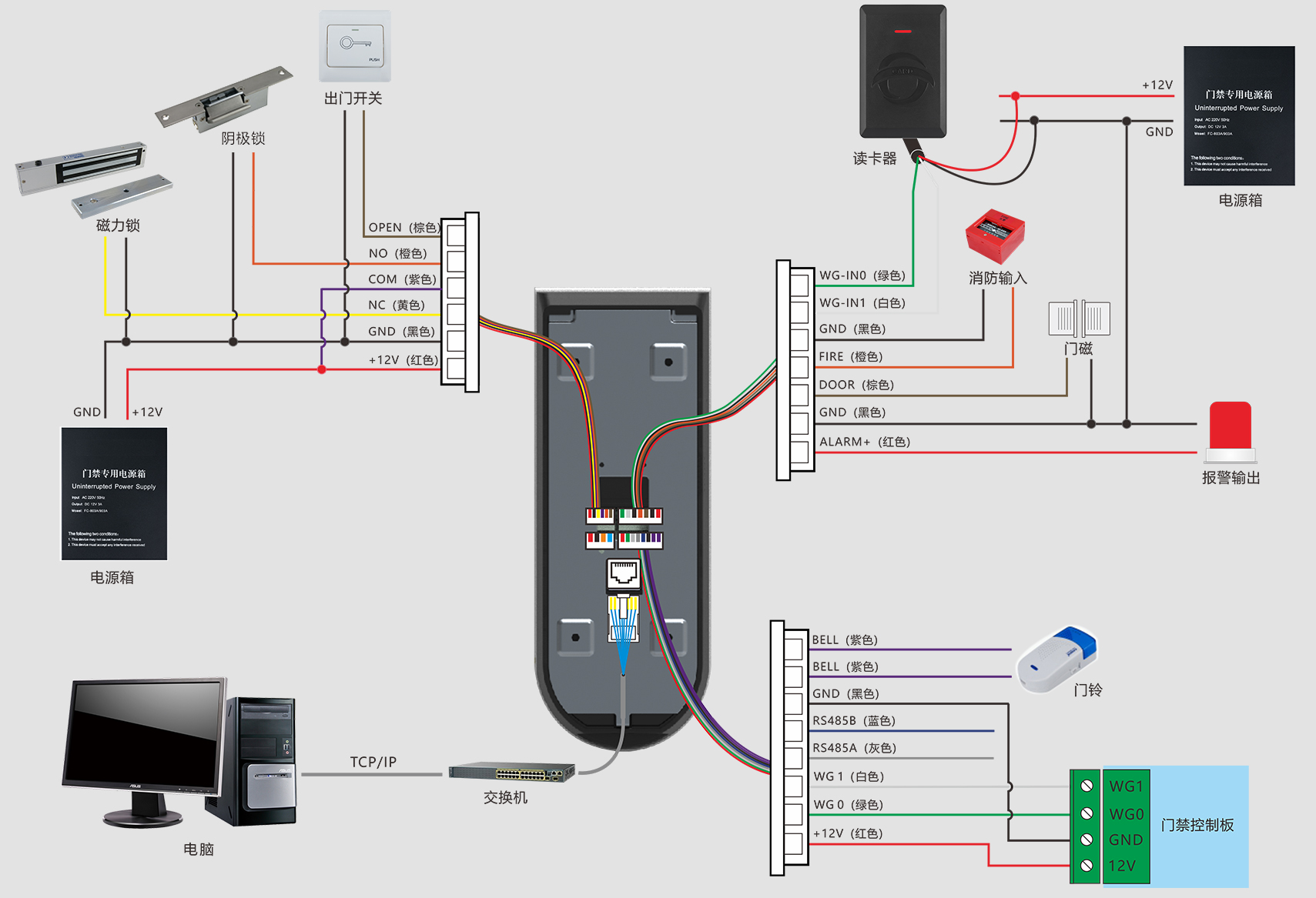 出门开关×1、门磁接口×1、消防输入×1、报警输出×1、Wiegand输出×1、Wiegand输入×1、门锁控制×1、USB×1、RS485×1