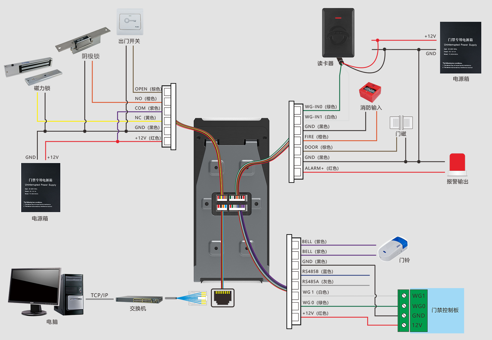 出门开关×1、门磁接口×1、消防输入×1、报警输出×1、Wiegand输出×1、Wiegand输入×1、门锁控制×1、USB×1、RS485×1
