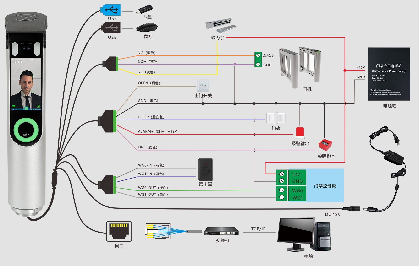 出门开关×1、门磁接口×1、消防输入×1、报警输出×1、Wiegand输出×1、Wiegand输入×1、门锁控制×1、USB×1、RS485×1