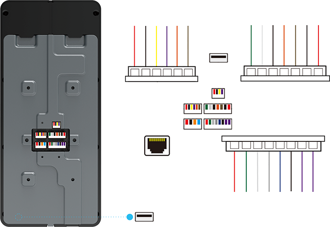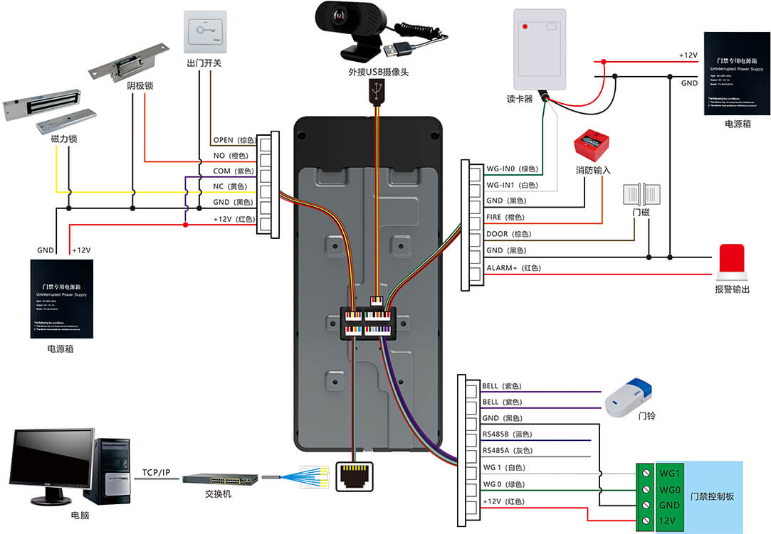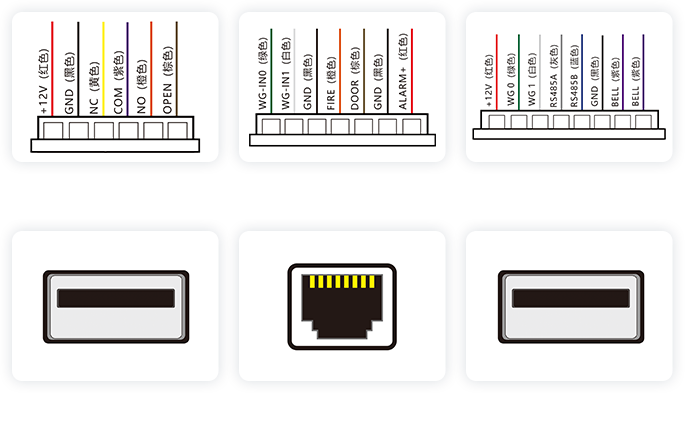 出门开关×1、门磁接口×1、消防输入×1、报警输出×1、Wiegand输出×1、Wiegand输入×1、门锁控制×1、USB×1、RS485×1