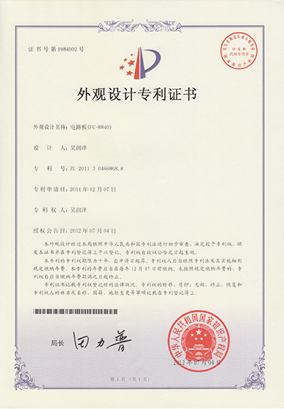2012.07.4祝贺FCARD荣获“FC-8840电路板外观设计专利证书”
