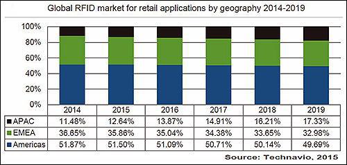 该题为“2015-2019年全球RFID零售应用市场”的报告,将市场按三个主要的地区进行划分。2014,美洲占52%,欧洲、中东和非洲(EMEA)市场占37%,亚太地区(APAC)大约有为11%。
