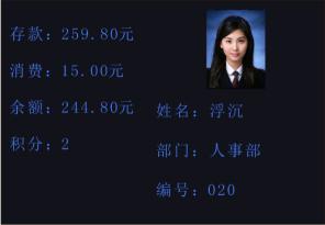 刷卡消费成功时界面可显示卡内余额、本次消费金额、卡内所有积分、持卡人姓名、所属部门及编号。刷卡消费成功后,界面一定会显示的有存款、消费和积分,其余内容若不想显示在界面中可通过软件进行设置。