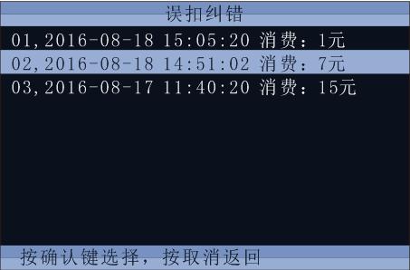 图上显示为可撤销的消费记录,选中好扣错的记录后,按“确定”键,界面提示:退款成功后拿开卡片,误扣的金额退回至卡片。