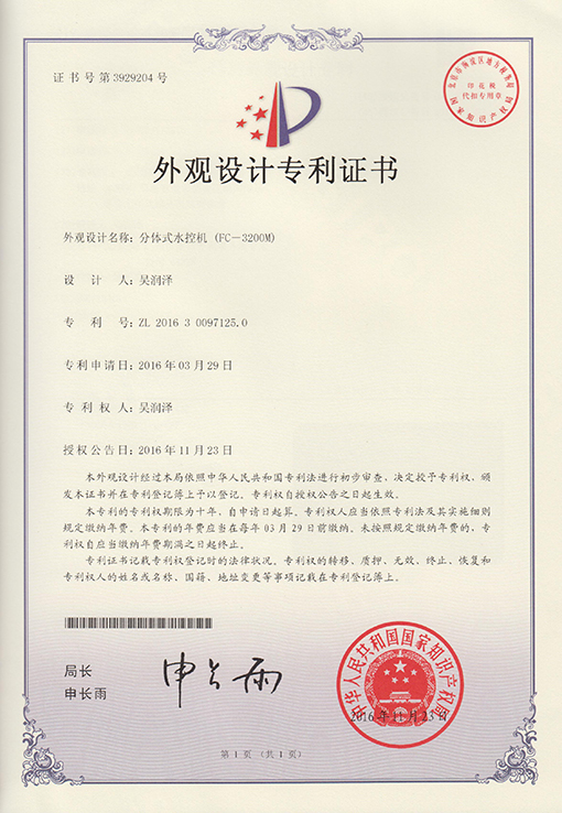 Congratulations that Guangzhou Fcard Electronics Co.,Ltd was awarded "FC-3200M Split Type Water Controller - Design Patent Certificate" which issued by State Intellectual Property Office.