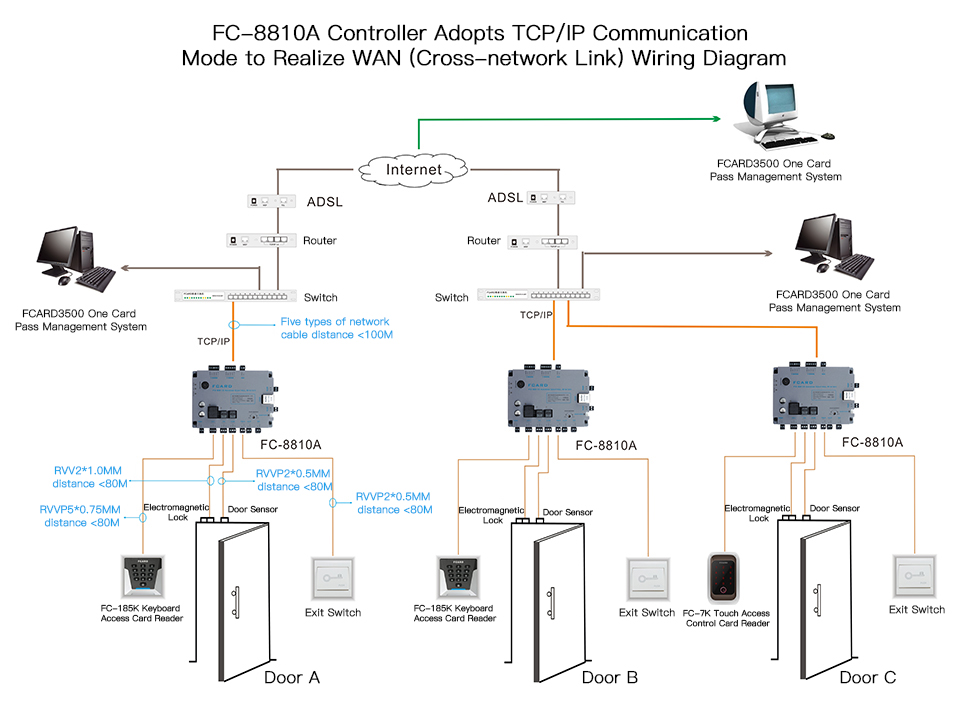 FC-8810A One door access controller adopts TCP/IP communication mode to achieve wide-area communication (cross-network segment link) wiring diagram