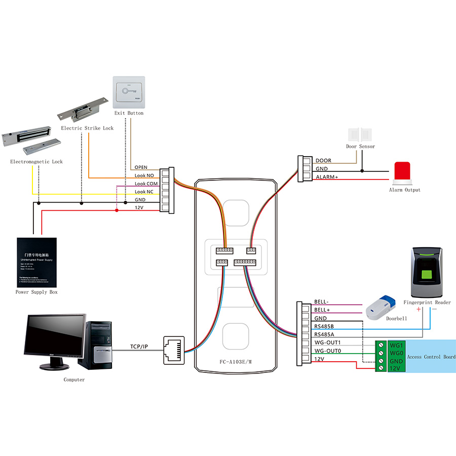 FC-A103 is a Fingerprint access controller, support network and standalone running. It uses multi-core ARM processor, mass memory. Built-in fingerprint identification circuit, support high-speed identification and rejection of false fingerprints. Fingerprint identification time < 1S, using 1.8 inch TFT color screen, support 1000 fingerprints, 1000 cards, 1000 passwords, 100,000 records, (Can be customized to support ID card or Mifare card), TCP/IP and RS485, support 1 group of unlock relay, 1 group of door sensor, 1 group of alarm output, can use U disk to backup data, support cloud platform. Simplified Chinese, English (other languages can be customized)