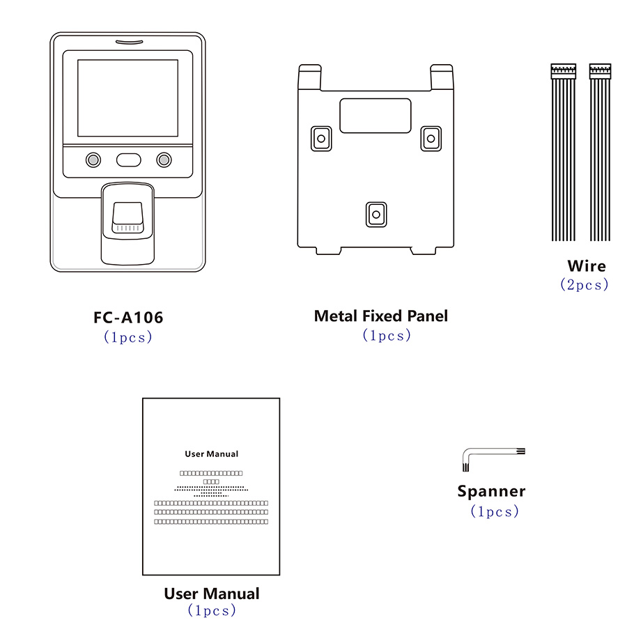 FC-A106 Fingerprint Face Recognition Time Attendance Access Controller adopts multi-core processor, integrated face and fingerprint algorithm, fingerprint rejection rate <0.01%, fingerprint recognition time <1S, 2.8 inch TFT color screen, support 2000 face, 5000 fingerprint, 5000 card , 5000 passwords, 200,000 records, support ID card (optional support Mifare card), TCP/IP networking, RS485 networking, support 1 set of door open relay, 1 set of door sensor, 1 set of alarm output, support U disk backup data, support cloud platform. Simplified Chinese, Traditional Chinese, English (support switching on the machine, other foreign languages can be customized) (desktop)