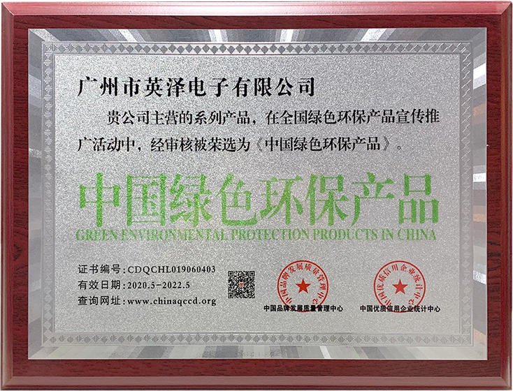 广州市英泽电子有限公司荣获由中国品牌发展质量管理中心、中国优质信用企业统计中心颁发的“中国绿色环保产品”“消费者信得过单位”。