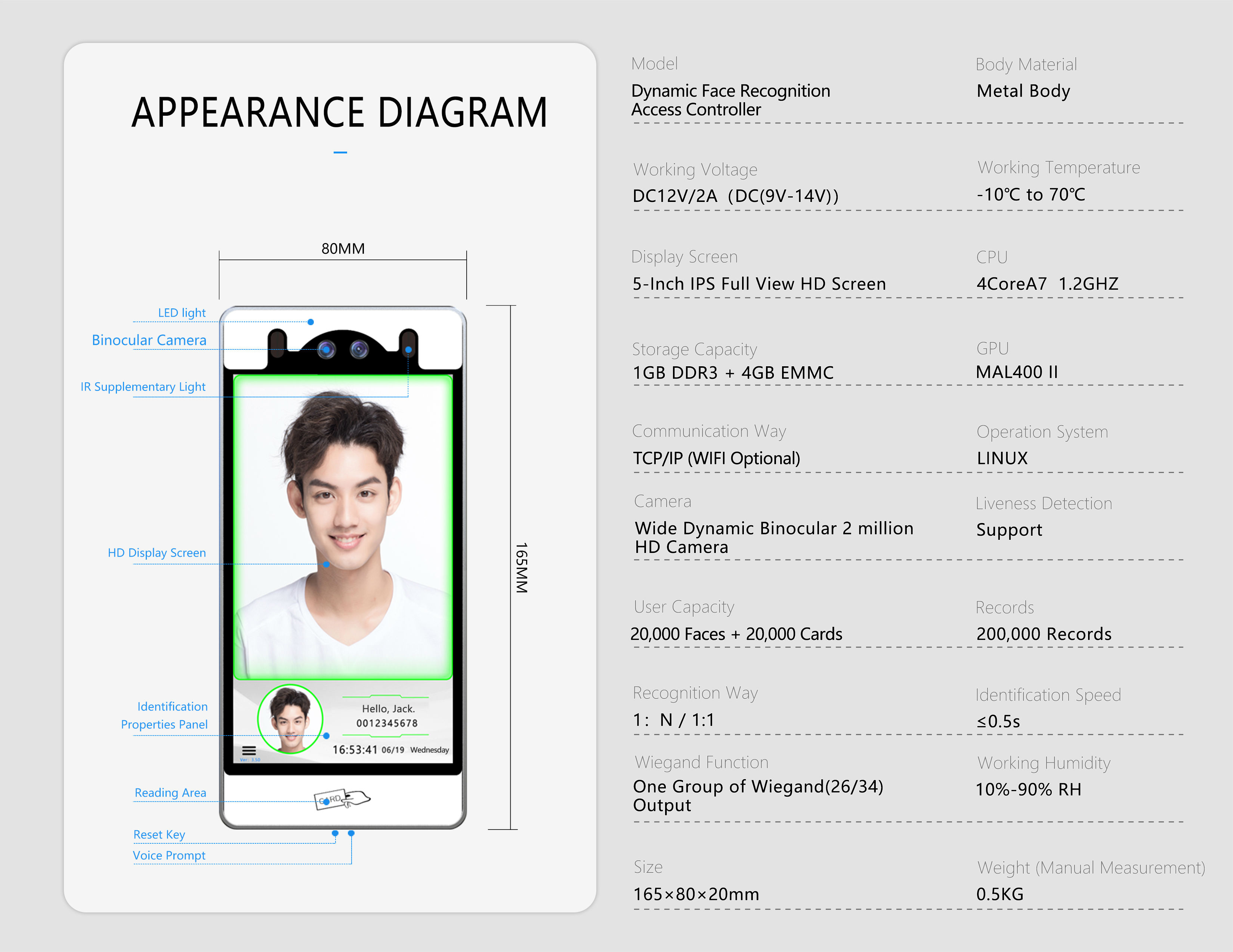 The FC-8100T face recognition access controller is used, what are the dimensions and technical parameters of the product?