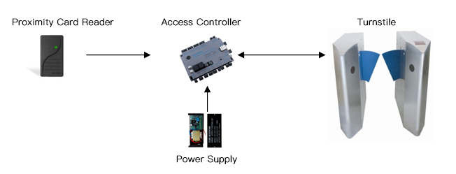 Passage gate (FCT-507,508,509), non-contact proximity card (the card can be printed with a pattern designed by the management center), access control main controller (FC-8810), proximity card reader (also known as proximity card reader, HID6008 ), card issuer (such as FC-202B), dedicated power supply (12V/3A)