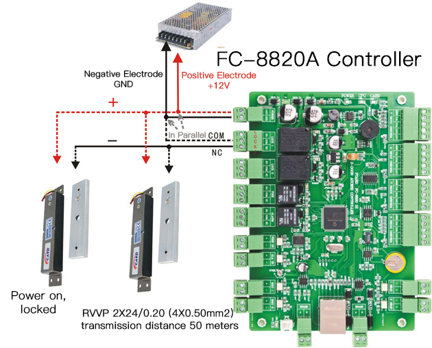 Connection Diagram of FC-8820A Two Doors Access Control Board and Magnetic Lock