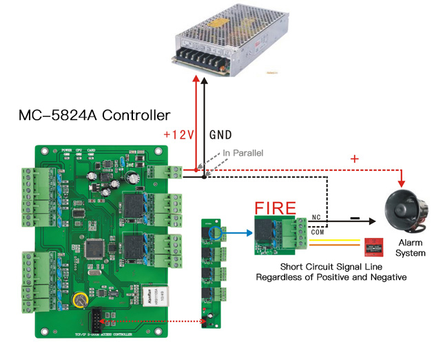 Hello, I learned from your company’s website that the MC-5824A four doors access control board has a fire alarm function, I would like to know how to operate to achieve this function, please provide detailed operating instructions or connection diagrams from your company, thank you!