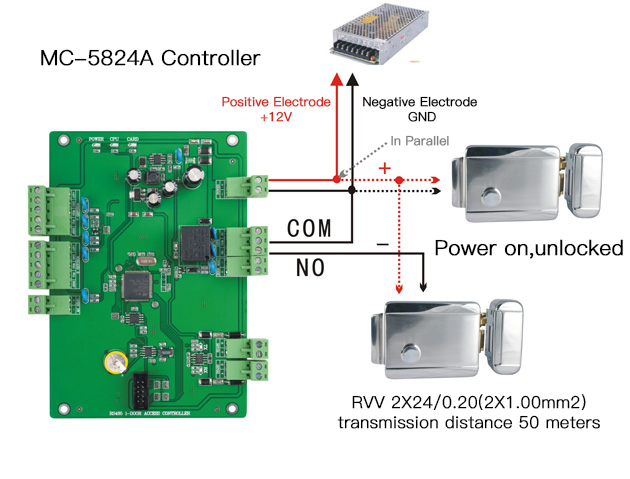 Connection Diagram of MC-5824A Two Doors Access Control Board and Electric Control Lock