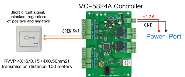 Connection Diagram of MC-5824A Two Doors Access Control Board and Exit Switch