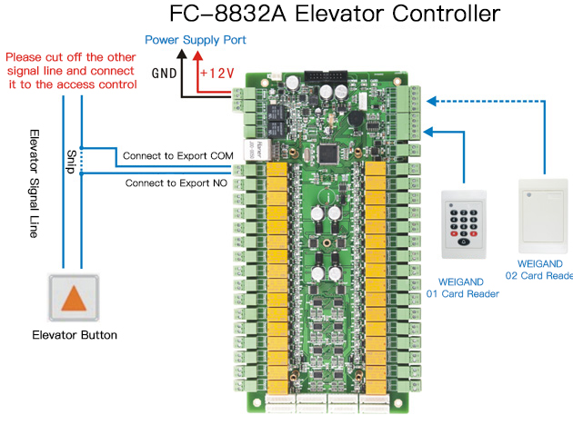 Hello, thank you for purchasing one of our company’s one card pass products, FC-8832A series elevator access control board supports up to two groups of WG26 or 34 card readers. You can refer to the following pictures to connect: