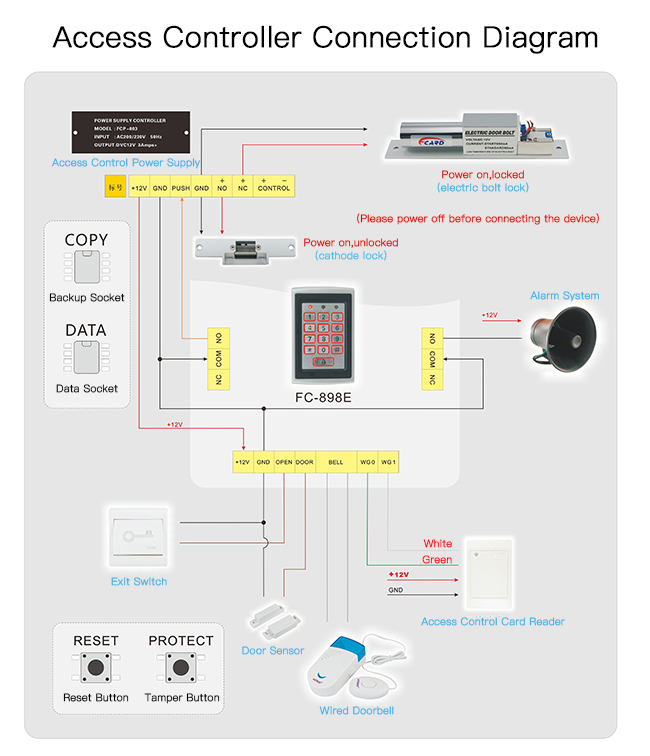 Hello, we have purchased your FC-898E access controller, I am installing this product for the first time, I want to know how this device is connected? We chose FC-898E access controller, FC-901 access control power supply and bolt lock.