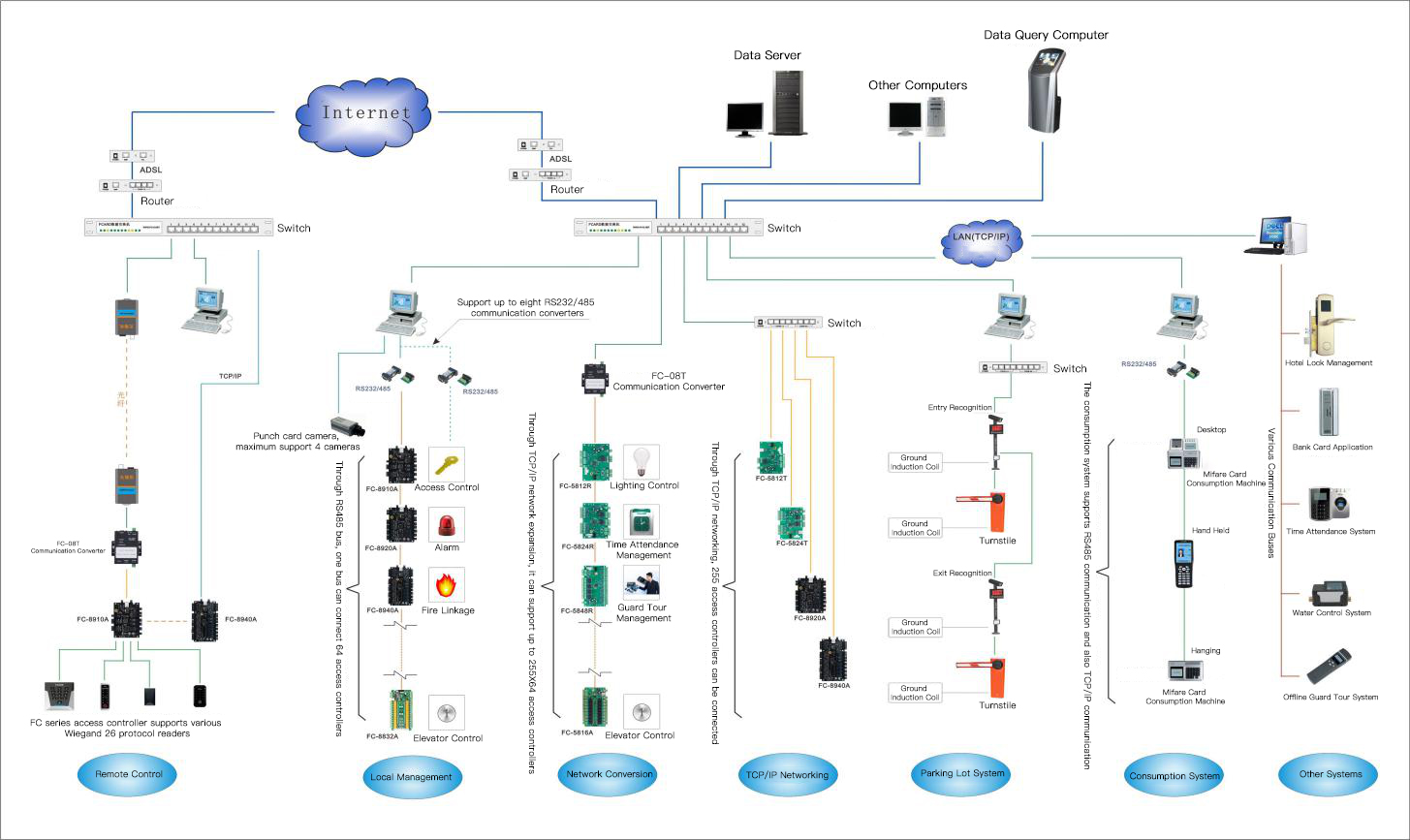 Hello, thank you for your attention to our company, below, I will attach a structural diagram of our company’s one card pass integrated system for your reference, if necessary, please call our company's free consultation number: 400-688-6663.