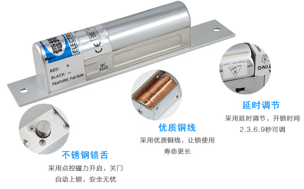 The principle of the four-wire electric bolt lock: It consists of two wires, two wires, usually red and black, the red can be connected to the power supply +12VDC, and the black is connected to GND. There are also two white wires, which are the door sensor signal wires. The electric bolt lock also feeds back the signal to the access controller according to the current door switch state. For example, the unclosed state of the glass door for a long time is based on these signals to convey information. The four-wire electric bolt lock is controlled by a single-chip microcomputer, which can ensure a good heating state, and the products with delay control and signal feedback are widely used.