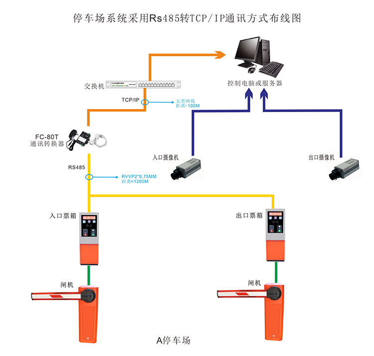停车场系统采用Rs485转TCP/IP通讯方式布线图