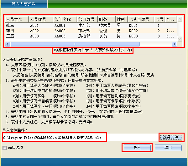 进入功能界面后,您可以在安装目录的 人事资料导入格式 目录中找到一个“摸板”文件,您可以通过Microsoft Office Excel 2003 或以上版本来编辑该文件,您只要按照摸板中排列顺序,格式(内容要严格按原文内容排列位置来编辑,不然会导入不成功)进行编辑或复制内容进去,就完成了导入内容的制作。