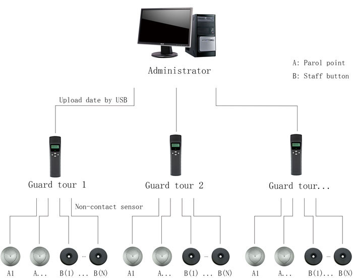 Guard Tour System: The security guard take it on the body to read the checkpoint , then record the place、time and situation. inductive (RFID) and contact (IB) two reading modes.<