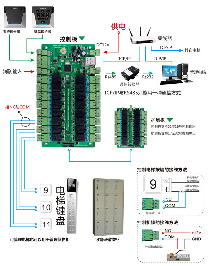 您好!感谢使用我们公司的产品!MC-5816A电梯控制板有两种模式,柜锁模式接NC和COM,电梯模式接NO和COM。详情请参考MC-5816A的接线图: