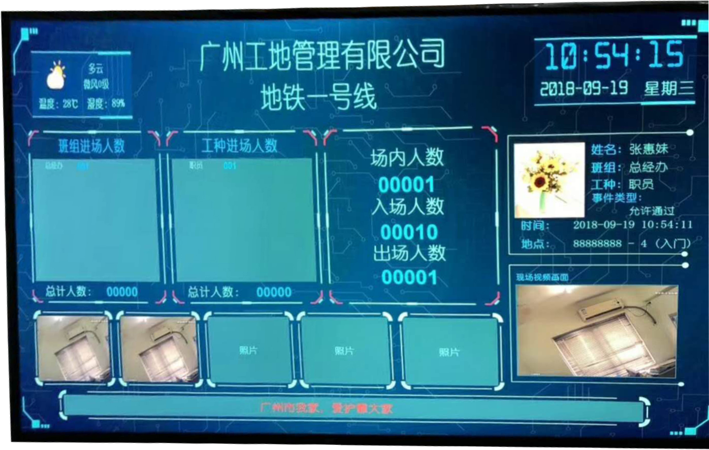 项目工地通过外接LCD显示屏或LED显示屏(如选用LED显示屏需搭配TCP通讯卡),实时显示场内人员信息(显示屏可显示进出的各部门人数、进出人员详细信息等)。另外,可在进出口安装网络摄像机对进出人员抓拍和录像,与登记时存储的图片进行对比,记录信息存储到SQL数据库中,从实际意义上解决生产施工现场社会流动人员随意出入、人员数量不明、信息不清等状况,提升工地的安全秩序和管项目工地通过外接LCD显示屏或LED显示屏(如选用LED显示屏需搭配TCP通讯卡),实时显示场内人员信息(显示屏可显示进出的各部门人数、进出人员详细信息等)。另外,可在进出口安装网络摄像机对进出人员抓拍和录像,与登记时存储的图片进行对比,记录信息存储到SQL数据库中,从实际意义上解决生产施工现场社会流动人员随意出入、人员数量不明、信息不清等状况,提升工地的安全秩序和管理漏洞等问题。理漏洞等问题。