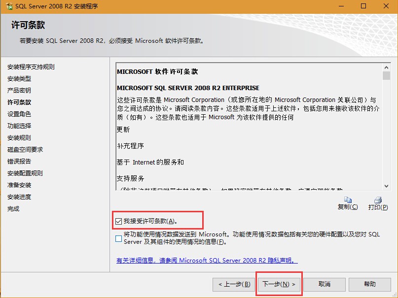 此处为请认真阅读并充分理解“MicroSoft软件许可条款”,勾选“我接收许可条款”以进行下一步操作。