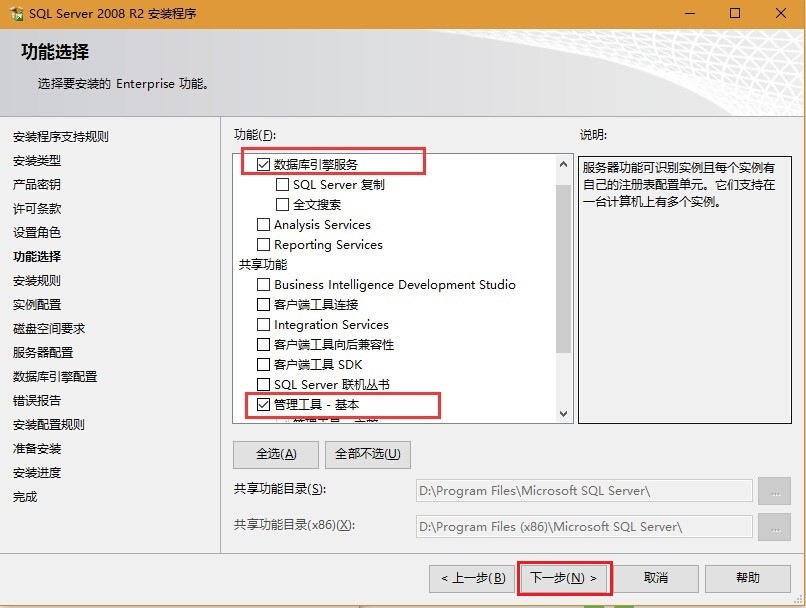 非开发者用户通常只需要使用到“数据库引擎服务”和“基本管理工具”,如果您需要在一台计算机上管理多台MS SQL Server服务器,我们建议您提示也勾选“客户端工具向后兼容性”。