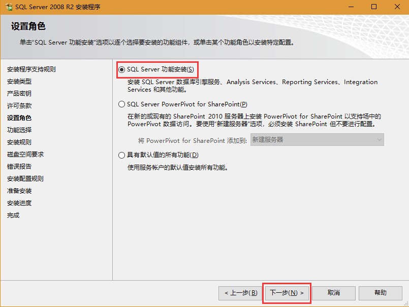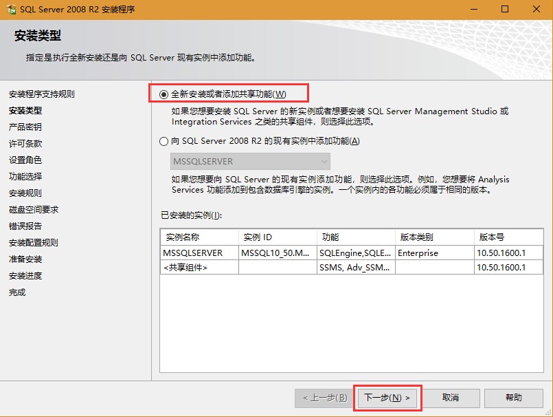 如图,“全新安装”我们需要选择第一个单选按钮(全新安装或者添加共享功能),然后继续下一步。