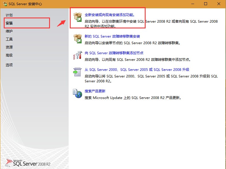 此时如果您的计算机上还没有安装MS SQL Server 2008 R2的服务时候应该选择“全新安装”,注意在非必需情况下我们不建议一台计算机中安装多个MSSQL服务,而他们也不能完全地互相兼容。