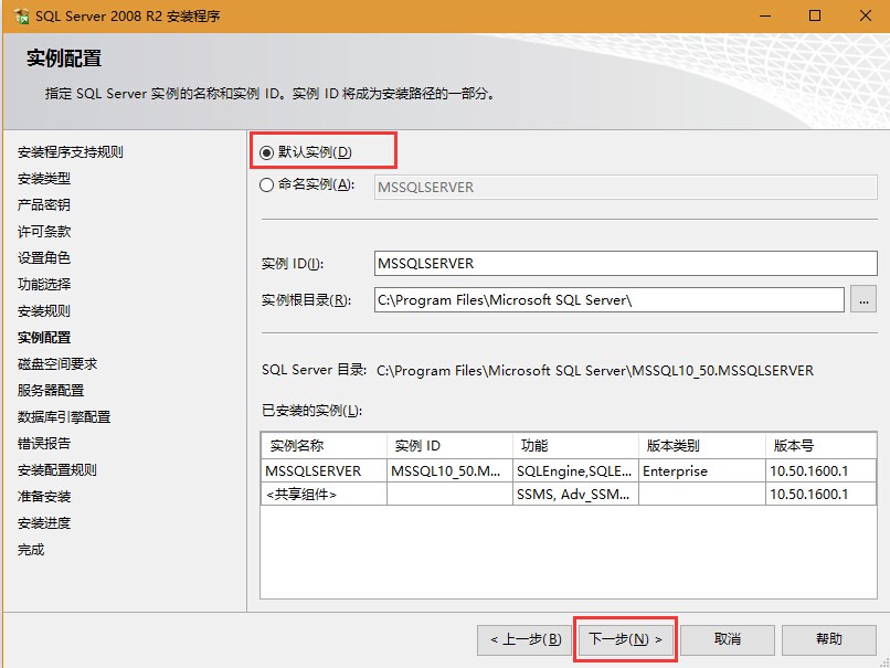 此处创建示例名称,如果计算机上只打算安装单个MS SQL Server服务,我们建议使用“默认实例”。