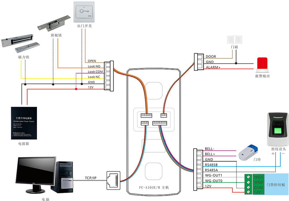 FC-A103是一款指纹门禁一体机,支持联网门禁考勤,也支持独立工作。采用多核ARM处理器,集合海量存储器,内置活体识别指纹电路,支持高速识别与拒绝假指纹。指纹识别时间 <1S,采用1.8寸TFT彩屏,支持1000指纹、1000卡、1000密码、10万笔记录、(可定制支持ID卡或IC卡)、TCP/IP联网、RS485联网、支持1组开门继电器、1组门磁、1组报警输出,支持U盘备份数据、支持云平台。中文简体、英文(可定制其它语言)