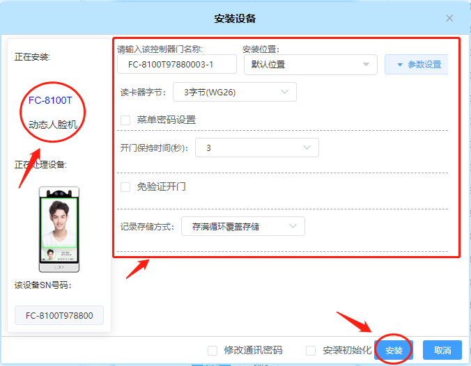 在【安装设备】页面,输入人脸机SN码,点击【确定】。SN码验证通过,打开【安装设备】页面,填写人脸机参数,点击【安装】,如图7-2所示: