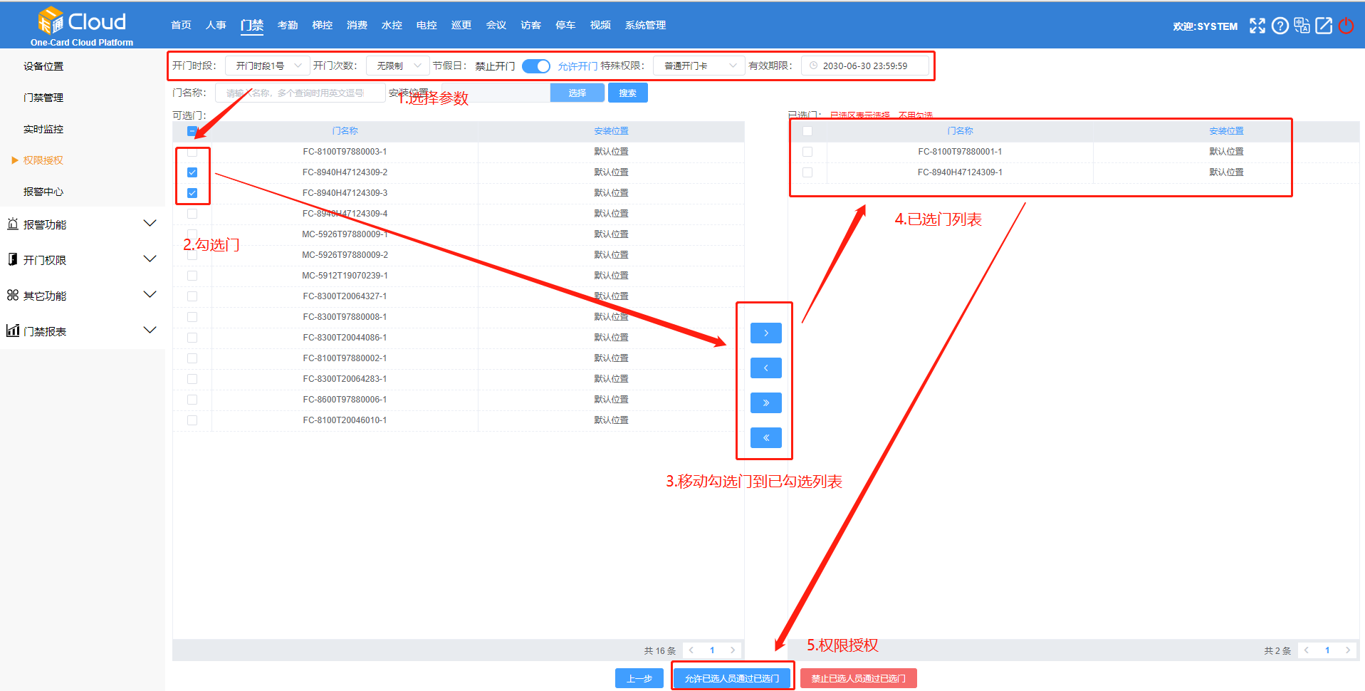 【允许已选人员通过已选门】添加指定用户对选定门的进出权限