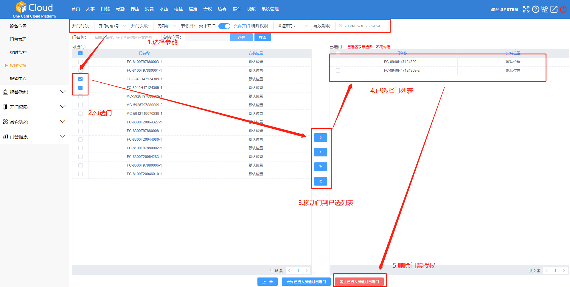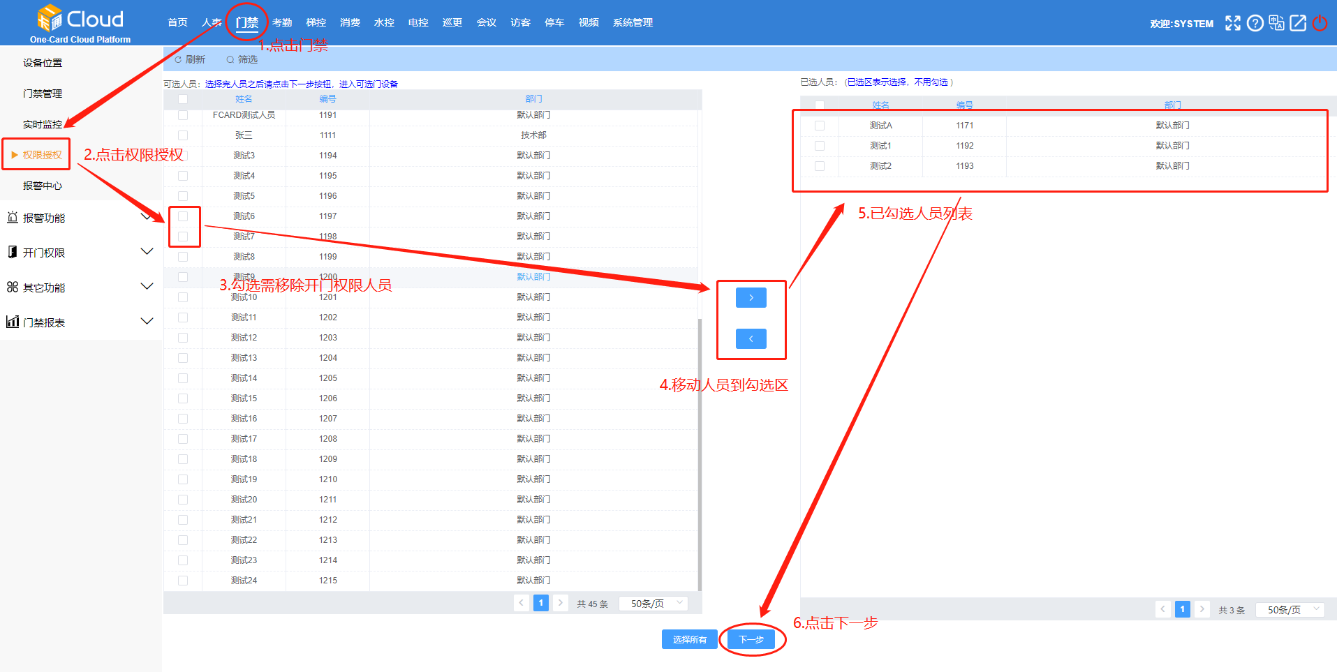 点击【门禁】-【权限授权】-勾选人员-移动人员到已选人员列表-点击【下一步】。如图9-1所示: