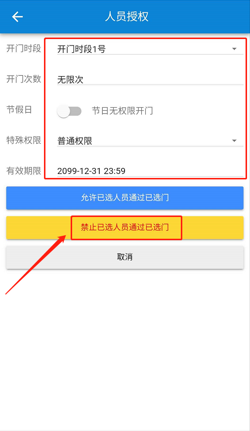 在【授权设备】页面,勾选门禁-点击【下一步】-填写参数-点击【禁止已选人员通过已选门】。如下图所示: