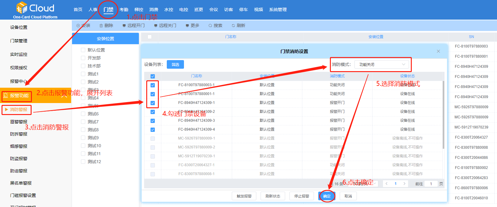 点击【门禁】-【报警功能】-【消防警报】。如下图所示:
