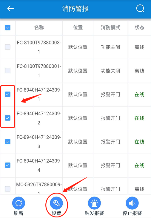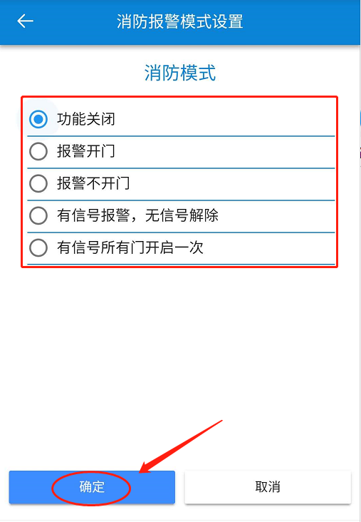 在【消防警报】页面,勾选门禁-【设置】-选择【消防模式】-点击【确定】。如下图所示: